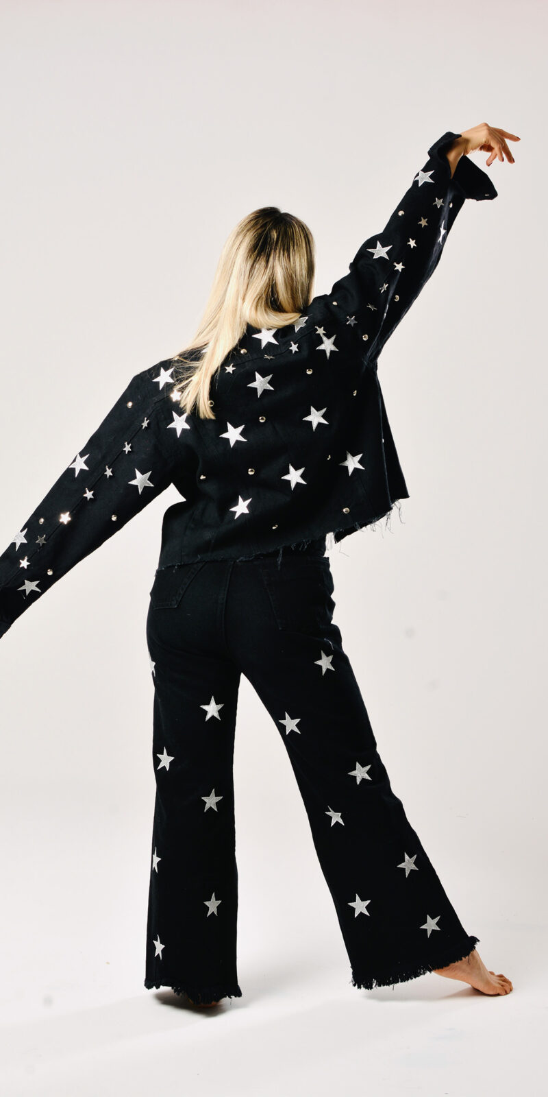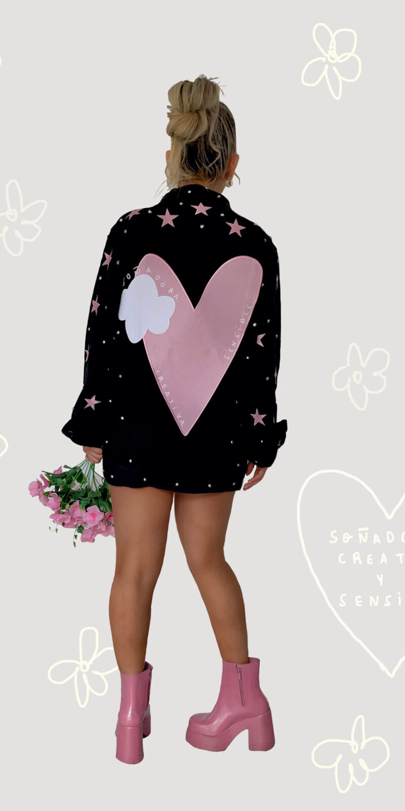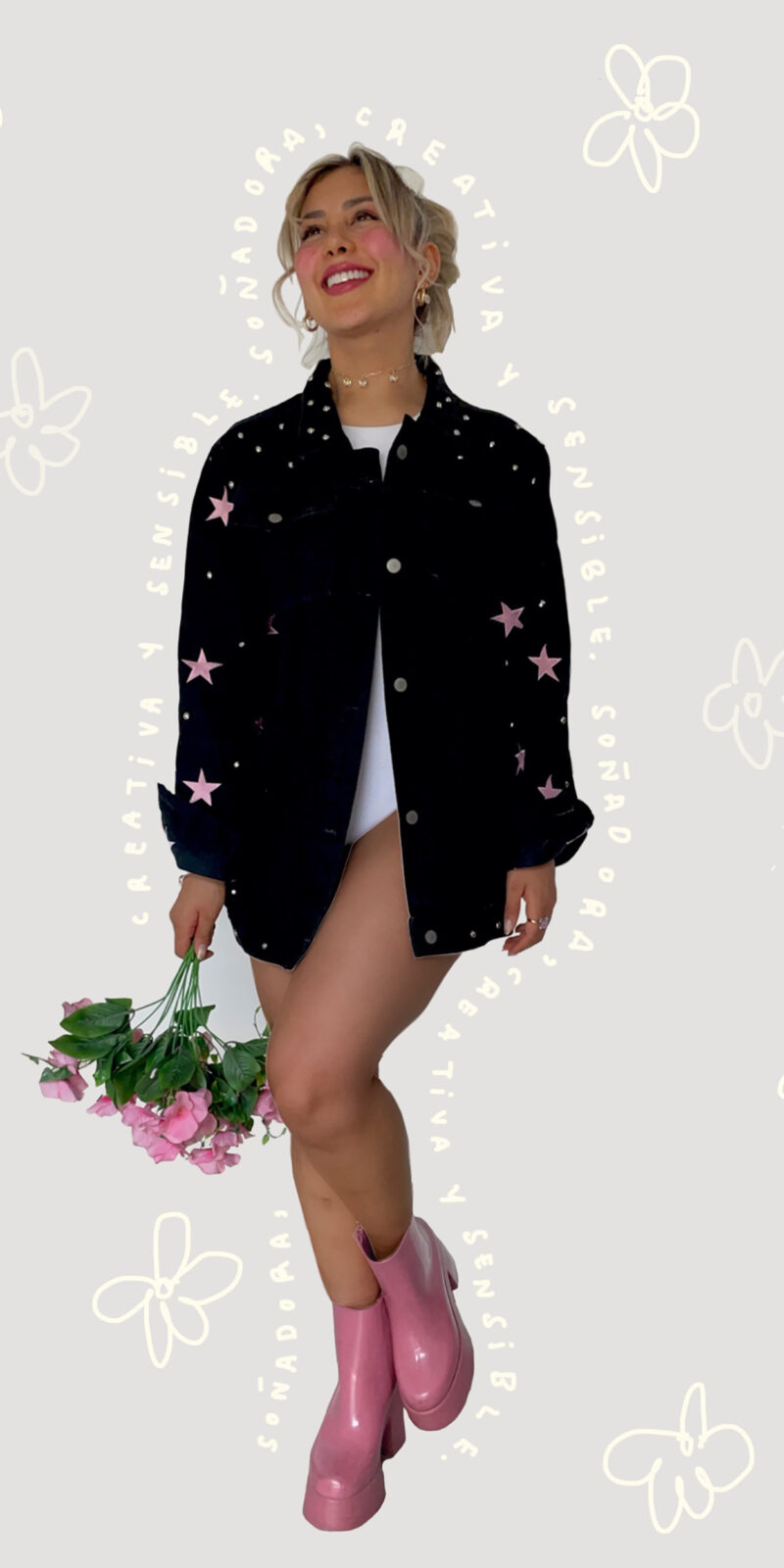 Esta Chaqueta es de tallaje oversized. Es elaborada 100% por manos colombianas no tiene ningún proceso industrializado. Su material es denim negro. Esta intervenida de manera manual con taches plateados en acero inoxidable. La frase y demás detalles son bordados en hilo mercerizado que te garantizaran que nada se moverá de su lugar. Esperamos que esta Chaqueta te recuerde lo maravillosa que eres <3.