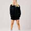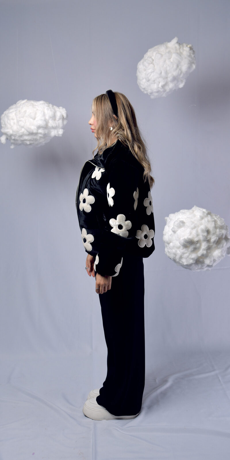 Chaqueta oversized en denim negro con bordado 100% en hilo mercerizado.