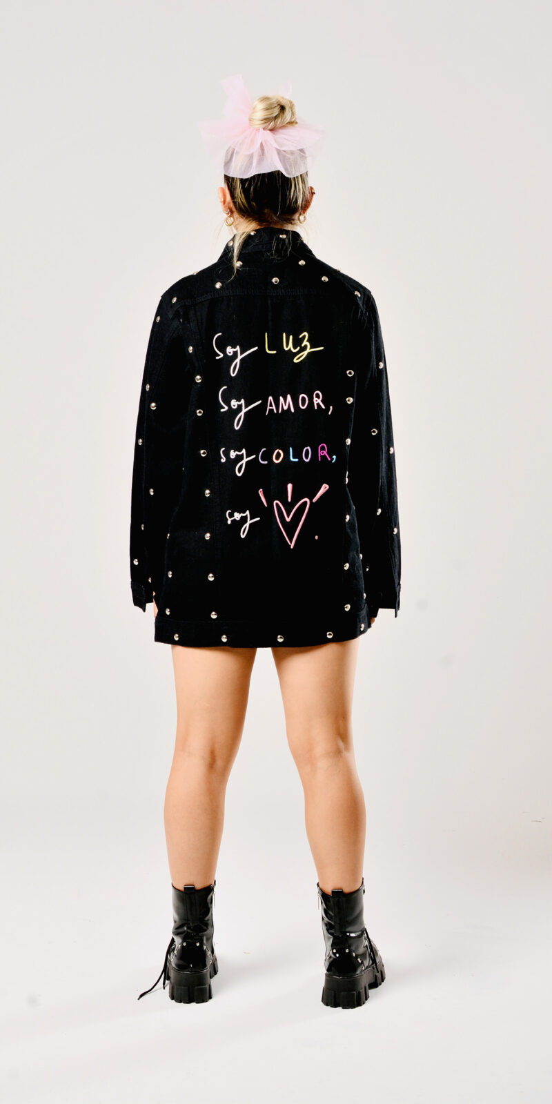 Esta Chaqueta es de tallaje oversized. Es elaborada 100% por manos colombianas no tiene ningún proceso industrializado. Su material es denim negro. Esta intervenida de manera manual con taches plateados en acero inoxidable. La frase y demás detalles son bordados en hilo mercerizado que te garantizaran que nada se moverá de su lugar. Esperamos que esta Chaqueta te recuerde lo maravillosa que eres <3.